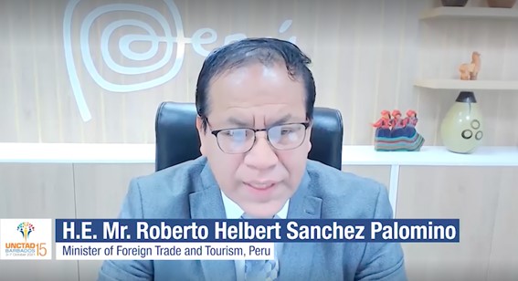 En la fecha, el Ministro de Comercio Exterior y Turismo, señor Roberto Sánchez Palomino, realizó una intervención en el marco del Debate General de la Decimoquinta sesión de la Conferencia de las Naciones Unidas sobre Comercio y Desarrollo (UNCTAD 15), que se viene desarrollando en formato virtual del 3 al 7 de octubre de 2021.