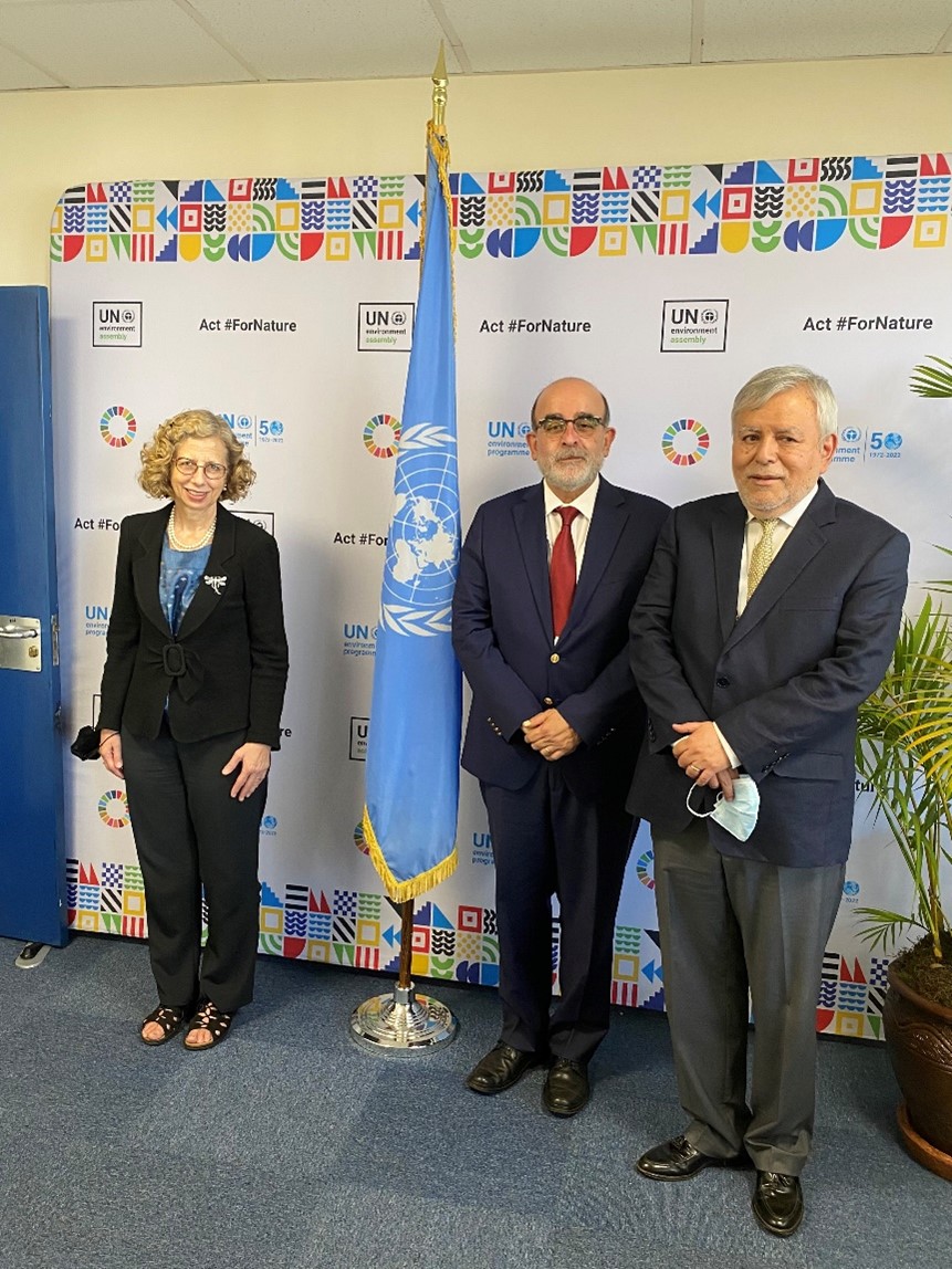 Foto leyenda : Directora Ejecutiva del PNUMA, señora Inger Andersen, Viceministro de Gestión Ambiental, Mariano Castro, y el Embajador Luis Chuquihuara Chil, Representante Permanente del Perú ante el Programa de las Naciones Unidas para el Medio Ambiente (PNUMA).